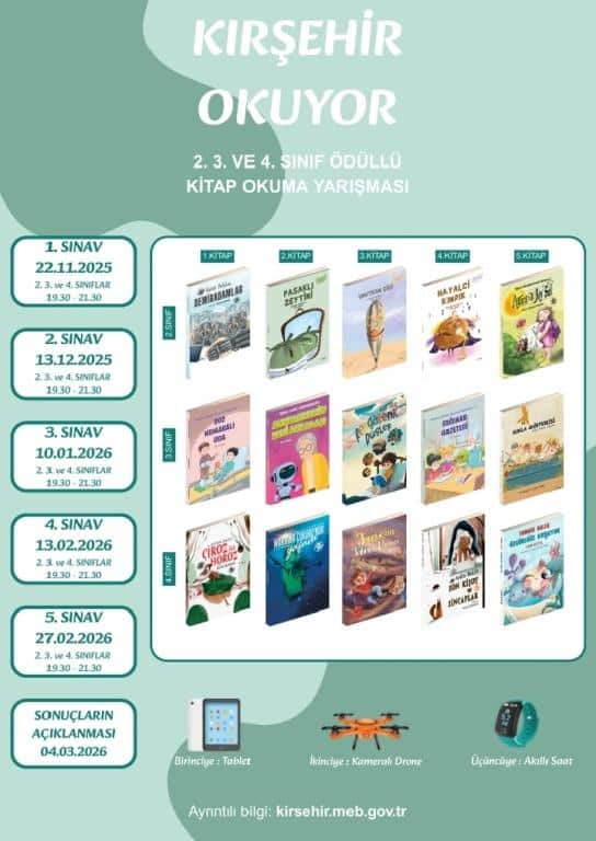 İl Milli Eğitim Müdürlüğümüz tarafından hayata geçirilen "Kırşehir Okuyor" Kitap Okuma Projesi ile 2. sınıftan 4. sınıfa kadar öğrencilerimiz, seçilen kitapları okuyarak çevrimiçi sınavlarla yarışacak ve okuma alışkanlıklarını pekiştirecekler.